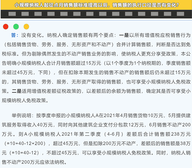 第一個(gè)問(wèn)題:小規(guī)模納稅人起征點(diǎn)月銷售額標(biāo)準(zhǔn)提高以后,銷售額的執(zhí)行口徑是否有變化?