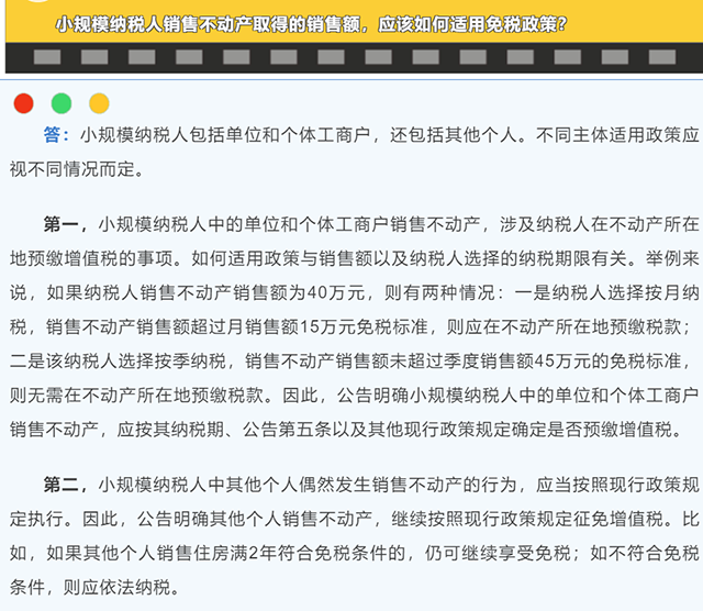 第五個(gè)問(wèn)題:小規(guī)模納稅人銷售不動(dòng)產(chǎn)取得的銷售額,應(yīng)該如何適用兔稅政策?