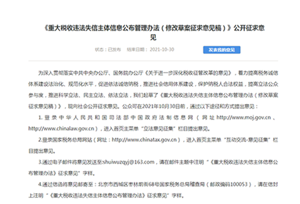9月30日,國(guó)家稅務(wù)總局發(fā)布《重大稅收違法失信主體信息公布管理辦法》(修改草案征求意見稿):