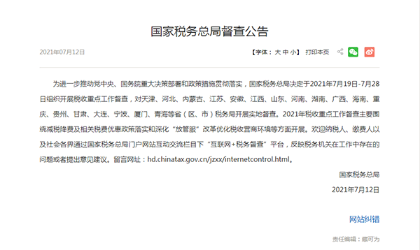 7月12日,國(guó)家稅務(wù)總局發(fā)布督查公告,涉及18個(gè)省份。
